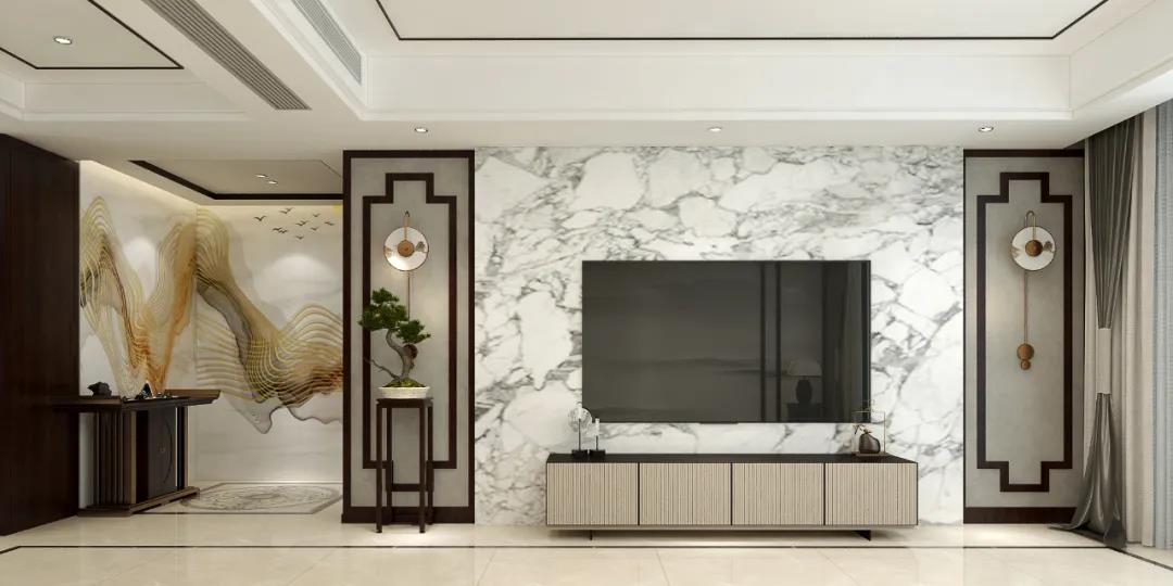 客廳設(shè)計(jì)上采用濃厚的新中式元素,不論是墻面的山水畫、還是線條勾勒如窗欞的花紋裝飾,無(wú)一不透露著中式獨(dú)有的詩(shī)畫韻味。電視墻采用大理石花紋,靈動(dòng)自然、奢華尊貴,再加以盤虬盆栽,打造出極富古典氣息的空間氣質(zhì)。