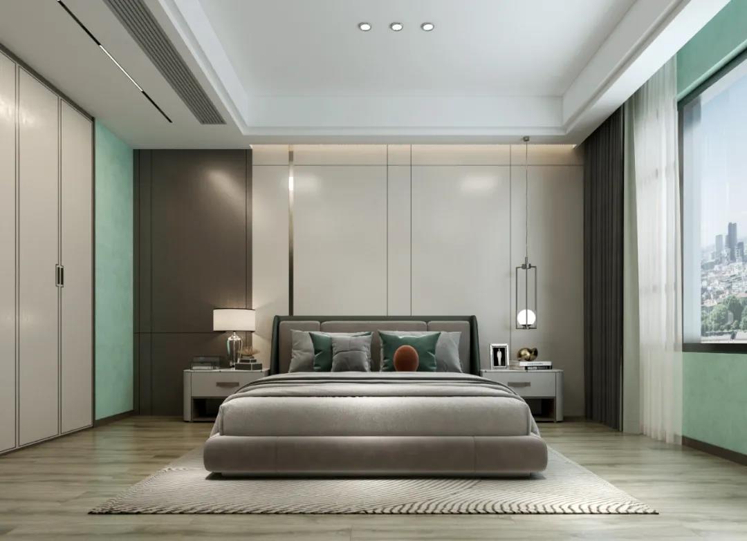 臥室整體去除復(fù)雜的設(shè)計(jì)元素,精準(zhǔn)提煉最能表達(dá)風(fēng)格的顏色,以灰綠、灰白、米色等低飽和度的色調(diào)進(jìn)行搭配,打造出素雅簡(jiǎn)潔、又頗有中式風(fēng)韻的休憩空間。