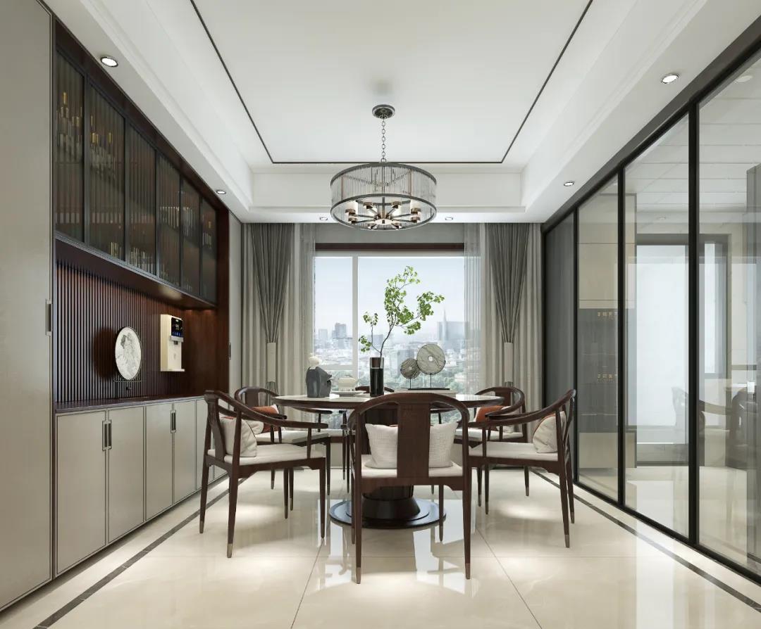 餐邊柜的設(shè)計(jì),利于物品的擺放和存取。上方柜體門透明,既能做收納之用,也能作酒柜展示之用。與整體風(fēng)格相符合的圓形餐桌,再次點(diǎn)名新中式的主題,更表達(dá)了傳統(tǒng)文化中對(duì)“團(tuán)圓”的期待。