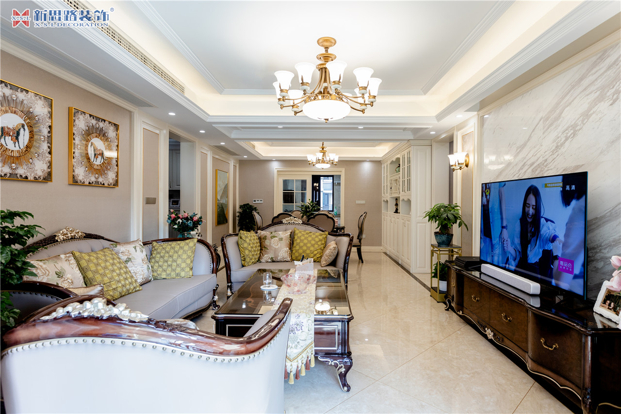 沙發(fā)背景墻使用石膏線(xiàn)材勾畫(huà)幾何圖形,古典優(yōu)雅;陶瓷的小鹿漫步花間,野趣橫生。復(fù)古花色的窗簾與真皮質(zhì)地的沙發(fā)以及實(shí)木電視柜搭配起來(lái)正合適,線(xiàn)條分割成菱形網(wǎng)格狀的乳白色電視背景墻大方低調(diào),黃銅色美式吊燈干凈明亮。深墨綠色的織錦桌旗無(wú)形中又添了點(diǎn)奢華意味,油青色的仿古裝飾擺件也是非常經(jīng)典的美式元素體現(xiàn)。