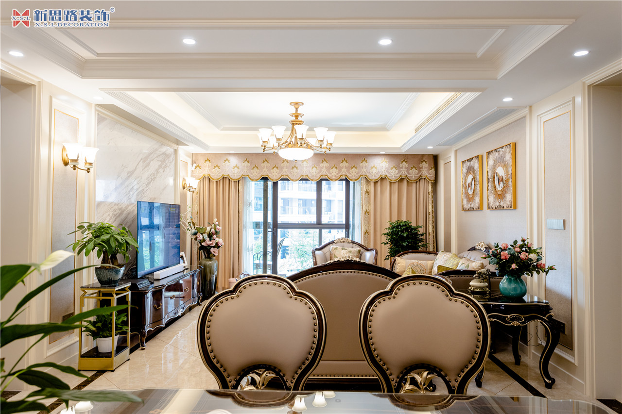 ● 戶(hù)型面積:130㎡ ● 設(shè)計(jì)風(fēng)格:簡(jiǎn)美風(fēng)格 ● 整體預(yù)算:60萬(wàn) 效果欣賞 『客廳展示』 沙發(fā)背景墻使用石膏線(xiàn)材勾畫(huà)幾何圖形,古典優(yōu)雅;陶瓷的小鹿漫步花間,野趣橫生。復(fù)古花色的