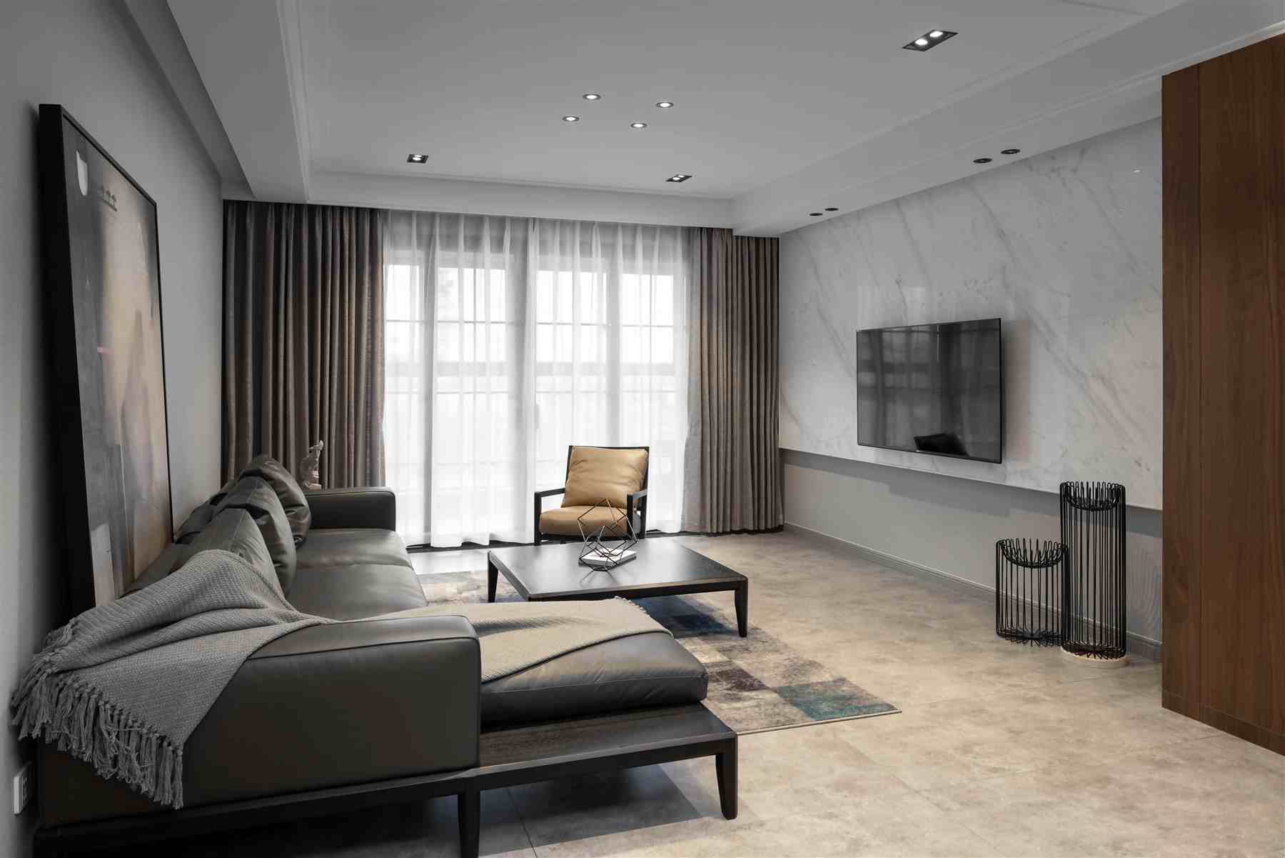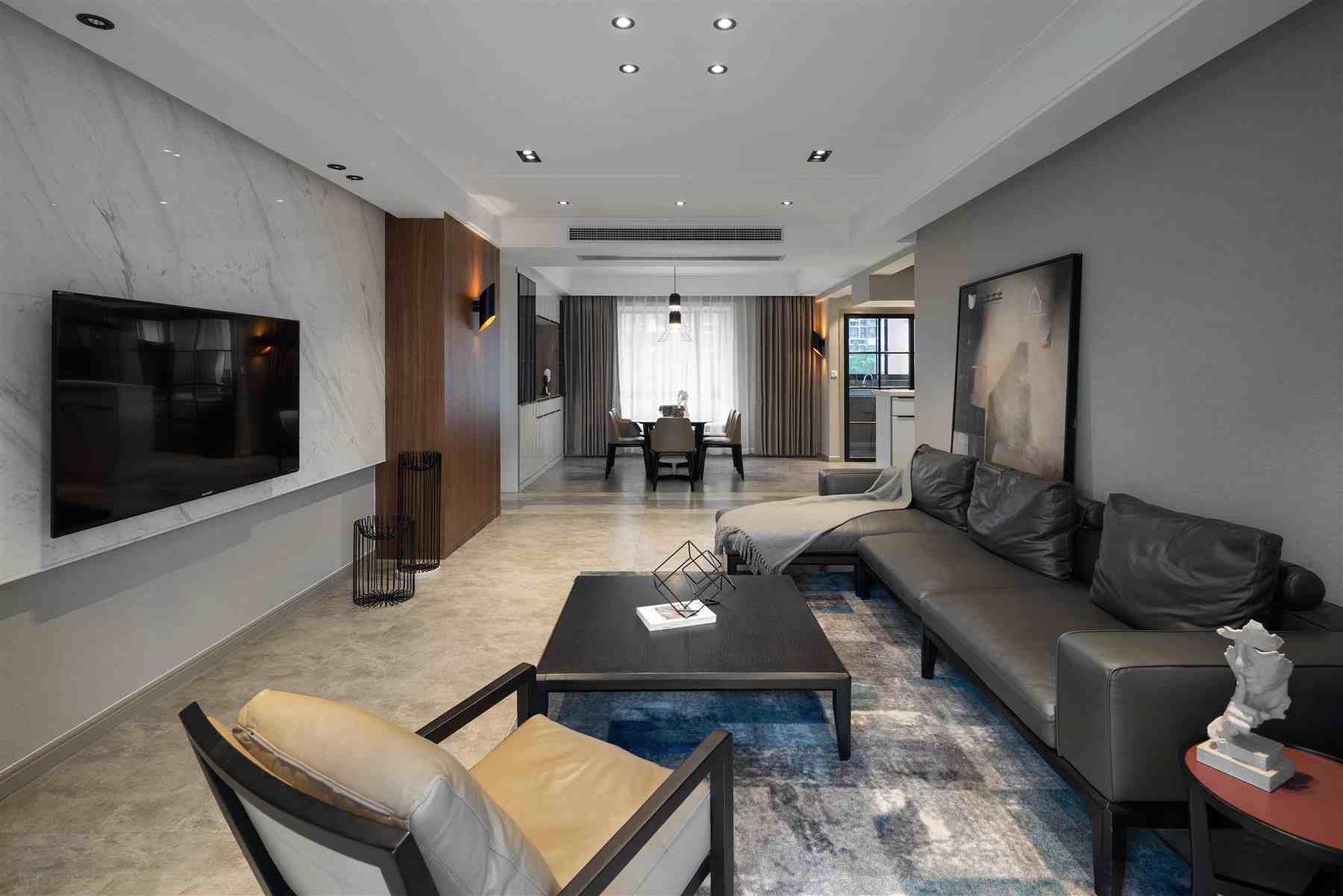 整體空間采用了黑白灰三種色調(diào),大面積的地毯鋪設(shè)與軟裝搭配,皆彰顯高品質(zhì)。