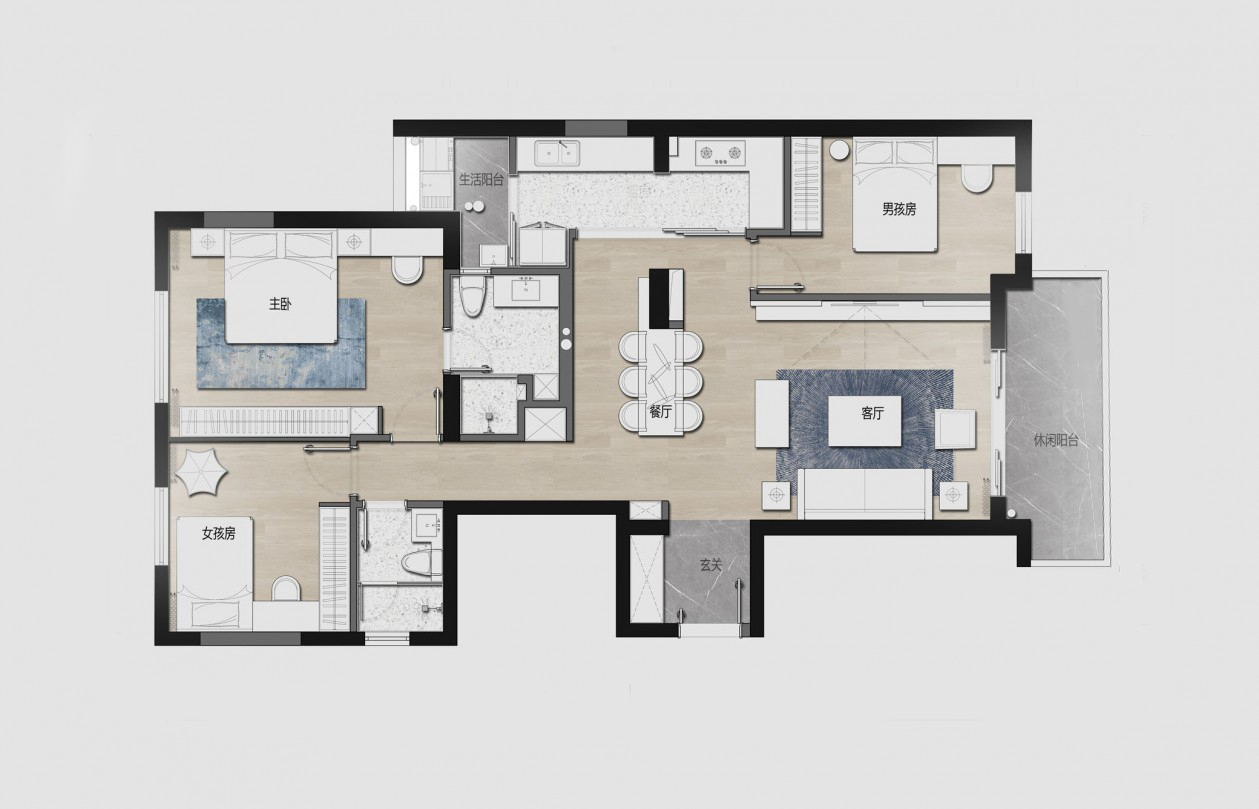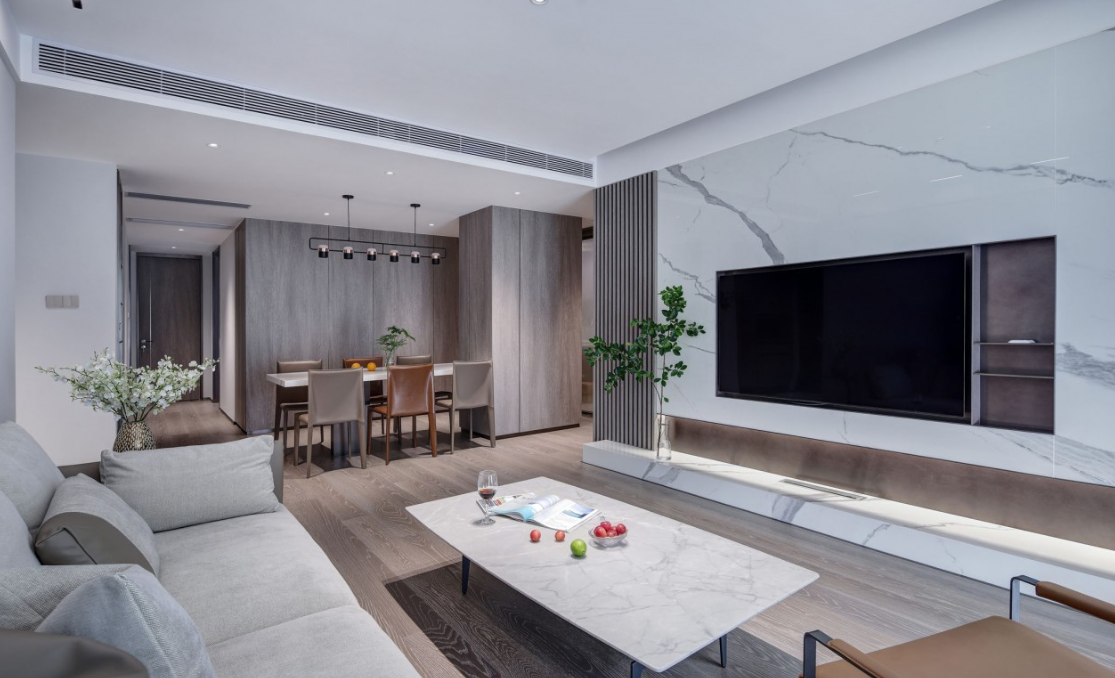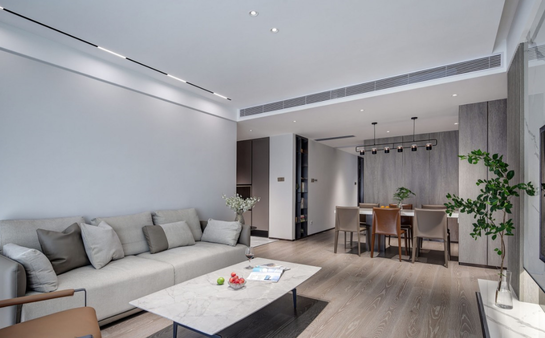 采用明亮而不眩目的無主燈設計,筒燈與磁吸燈簡約靈活的泛光照明電視背景墻下隱藏燈帶的效果營造,優(yōu)化了空間形體以及局部的明暗關(guān)系