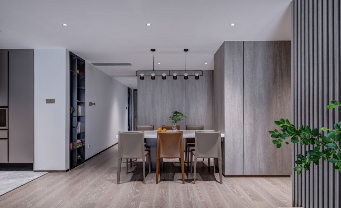餐廳承重柱是不少人會選擇回避的設計難點,設計師獨出心裁,將大理石桌面嵌入其內(nèi)遠遠望去,白色餐桌宛若浮空、靈動而輕盈,同時完美消解了承重柱礙眼的視覺效果