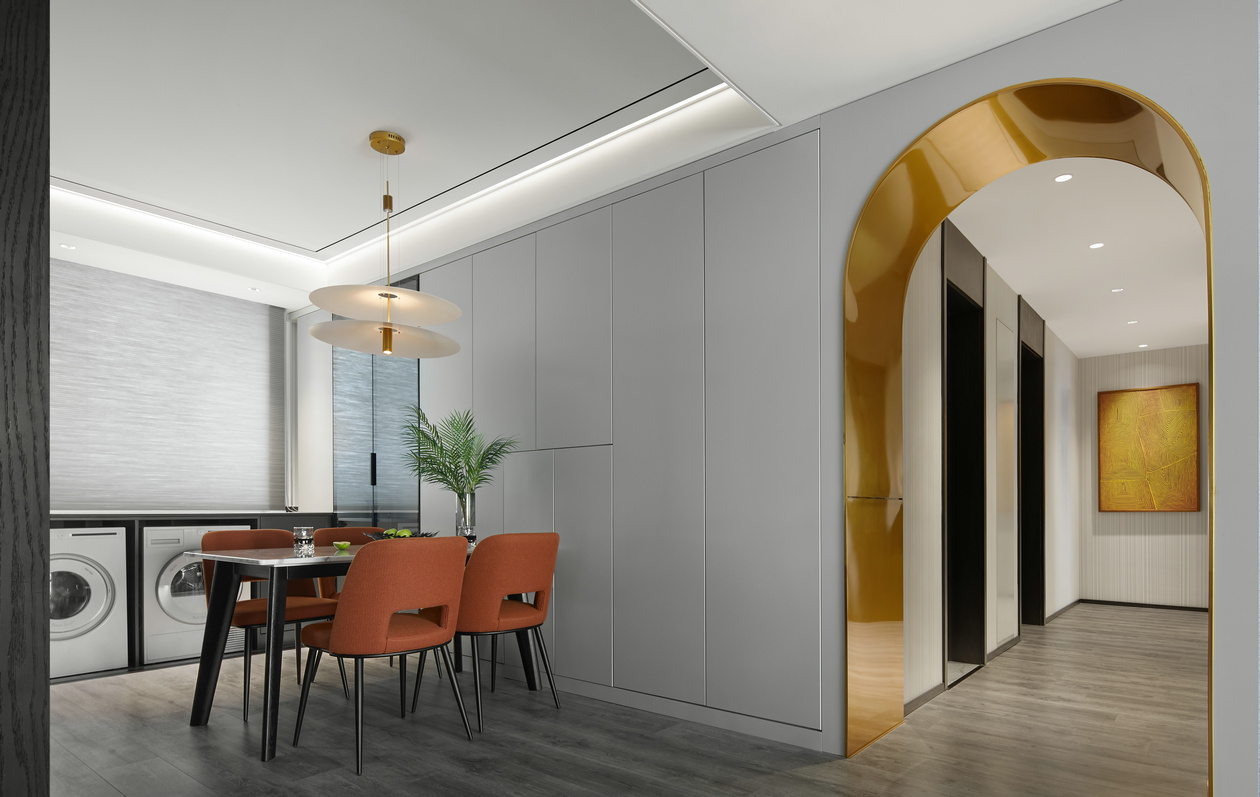 餐廳與客廳之間毫無阻隔,可以想象與好友們相聚用餐時(shí)的開放與隨性,不拘泥于空間的功能性。金色的包邊線條與白色皮革組合,產(chǎn)生一種當(dāng)下潮流的時(shí)尚之美,同時(shí)透過色彩搭配,來增強(qiáng)空間的整體性。