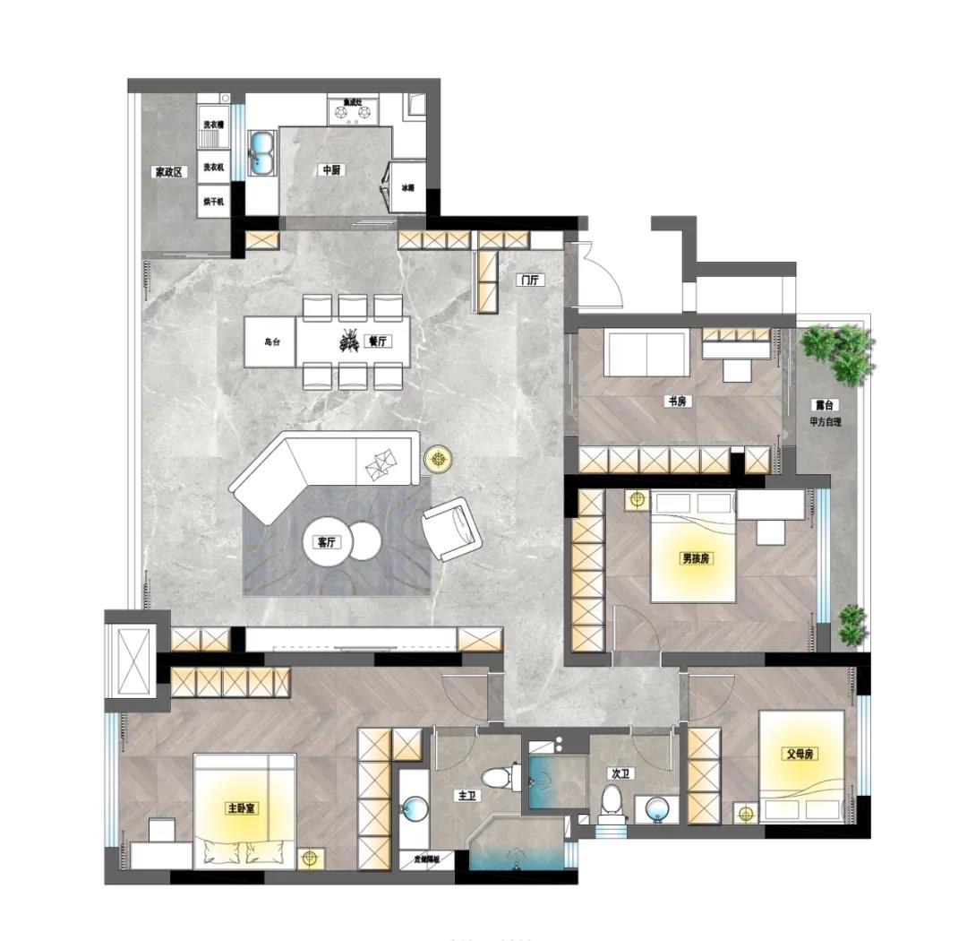 本案設(shè)計(jì)入戶門廳即可以達(dá)到私密獨(dú)立性,又可以讓整體空間大氣端莊,吊頂是無主燈的設(shè)計(jì)手法打造,主臥室以及兒童房的收納柜與學(xué)習(xí)功能得到了最大化,主衛(wèi),次衛(wèi)空間考慮到干濕區(qū)分明,實(shí)現(xiàn)了客戶對(duì)新房的所有需求。