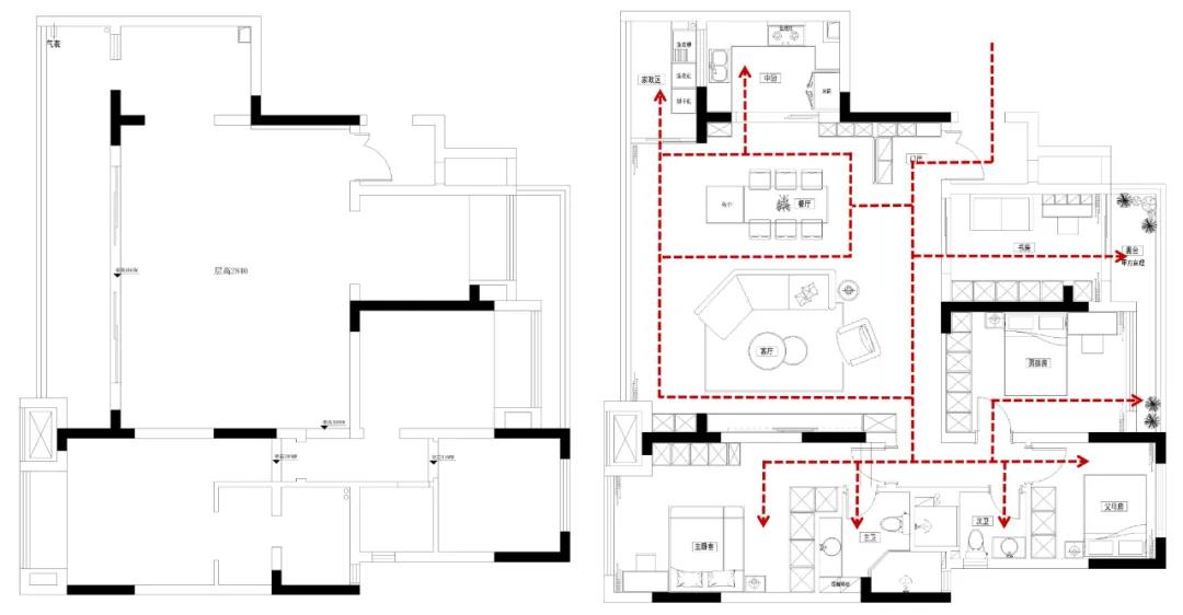 本案例中,常住人口是祖孫三輩5人,空間規(guī)劃上,客戶有比較大的收納需求。在充分了解客戶喜愛的設(shè)計(jì)風(fēng)格與需求后,設(shè)計(jì)師結(jié)合實(shí)際戶型,將一個(gè)輕奢又溫柔的家居空間呈現(xiàn)在我們面前。