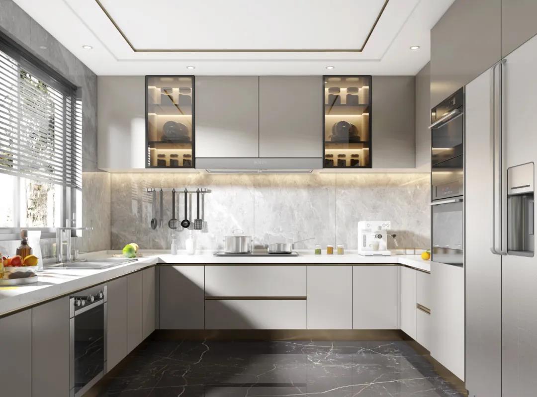 廚房主色調(diào)采用灰白色,讓空間看起來更加干凈溫柔。吸頂式的抽油煙機(jī)相較傳統(tǒng)油煙機(jī)來說造型更為流暢,智能化烹飪?cè)O(shè)備齊全,滿足客戶一家的多樣化烹飪需求。