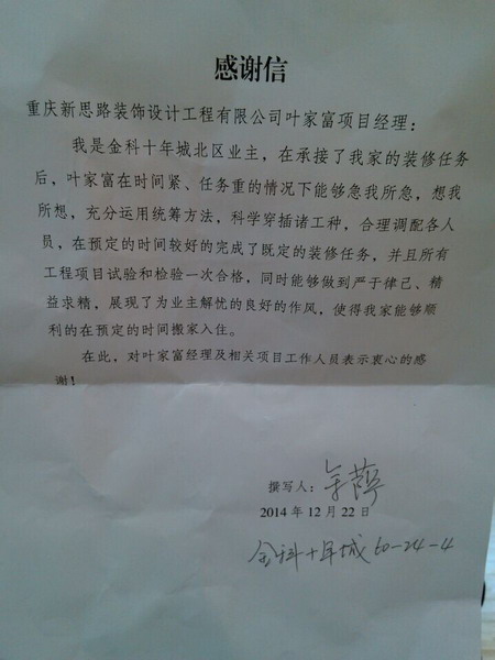 12月22日下午,新思路裝飾江北店收到了金科十年城業(yè)主余老師親自送來一封感謝信。信里洋溢著她對(duì)公司及葉家富工長的贊美和感謝之情,也讓我們感受到了來自冬日里的一抹溫暖和感動(dòng)。