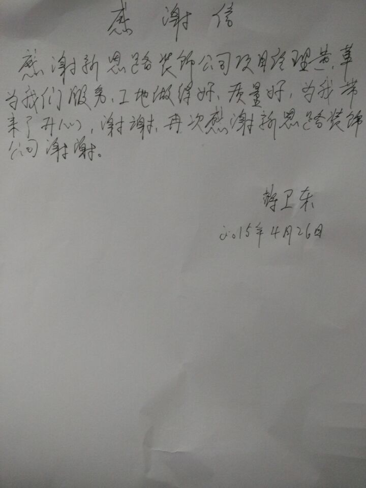 在信中,蔣老師表達(dá)了對新思路裝飾和黃工長的感謝之情:“感謝新思路裝飾公司,也感謝黃工長,工地做得好,服務(wù)好,為我?guī)砹碎_心,再次謝謝”!