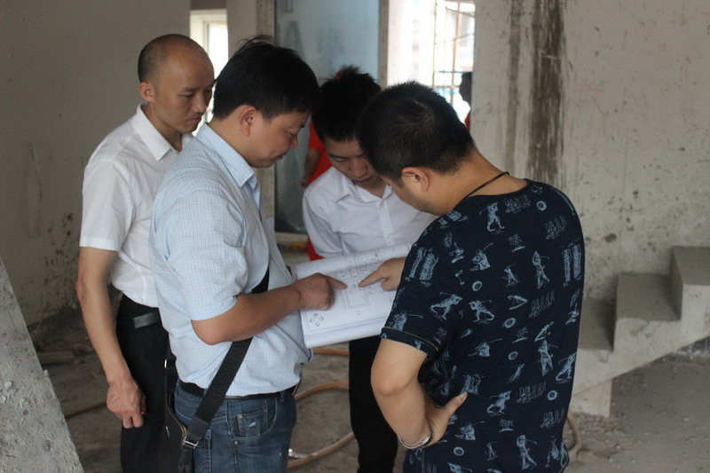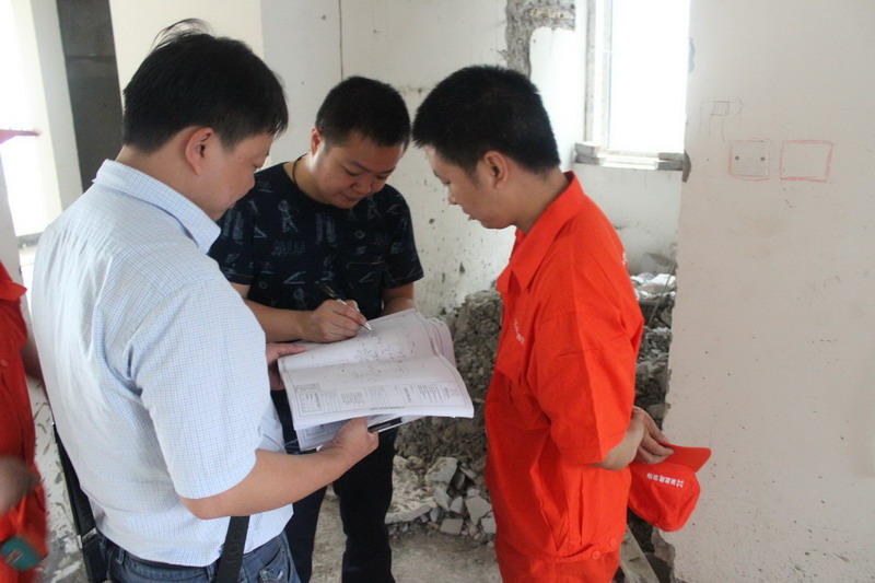 工長和工人師傅對(duì)照?qǐng)D紙,認(rèn)真討論電線的排版、走位;插座組數(shù);強(qiáng)弱電箱安裝位置等細(xì)節(jié)。