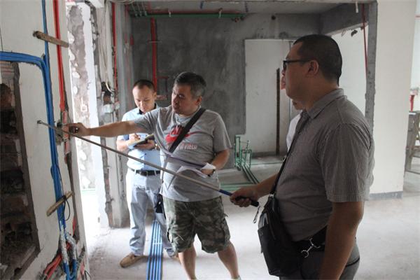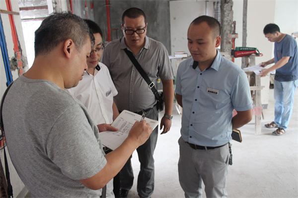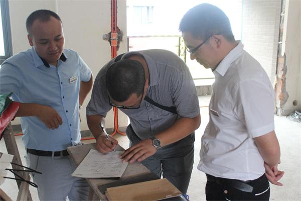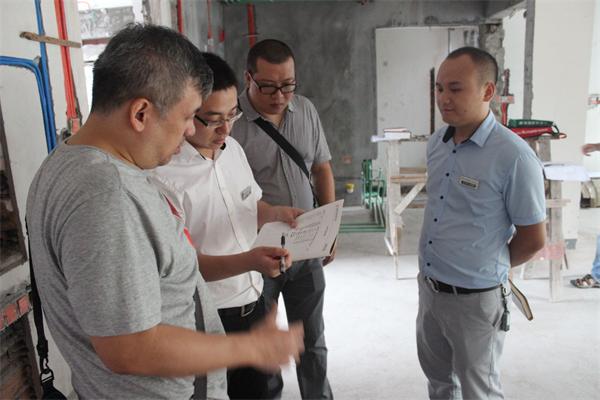 質(zhì)檢正在向馬老師介紹公司水電驗(yàn)收標(biāo)準(zhǔn)