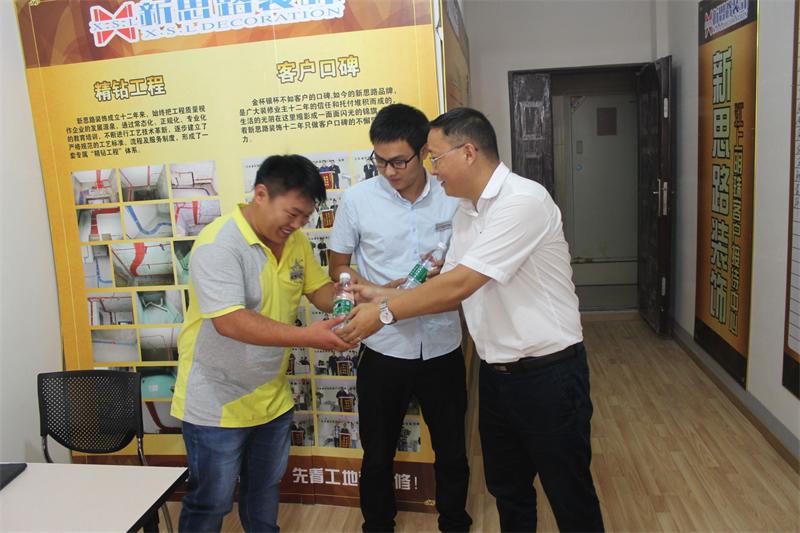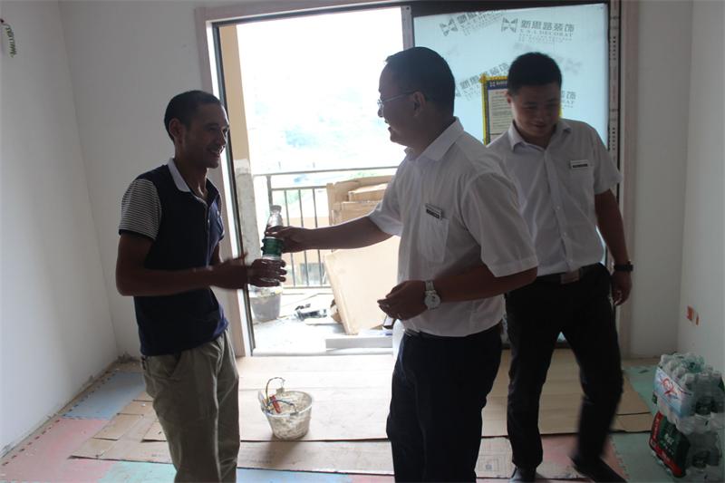 時(shí)下已是8月下旬,但山城氣溫依舊高居不下。炎炎夏日,驕陽似火,正是公司各施工工地趕工期、保品質(zhì)的黃金時(shí)期。為了做好夏季防暑降溫工作,確保廣大一線員工的身心健康和安全,8月26日,新思路裝飾“2015夏季送清涼”活動(dòng)正式啟動(dòng),以工程部、南坪店、北紅星店等部門組成的慰問小組,帶著藿香正氣水、礦泉水等防暑降溫物品,深入到工地施工一線,親切慰問在高溫下奮戰(zhàn)的工人師傅們,給他們送去了公司的關(guān)懷和絲絲清涼。