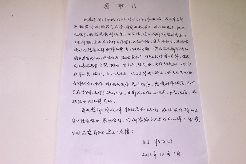10月7日下午,華潤(rùn)二十四城19-1-26的業(yè)主楊老師親自來(lái)到新思路裝飾南坪總部,將一封滿含謝意的感謝信送到了工程部文經(jīng)理手中。
