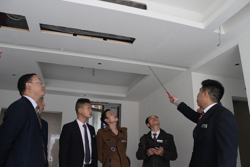 質(zhì)檢正在向大家詳細(xì)講解吊頂?shù)氖┕ひ?br />
