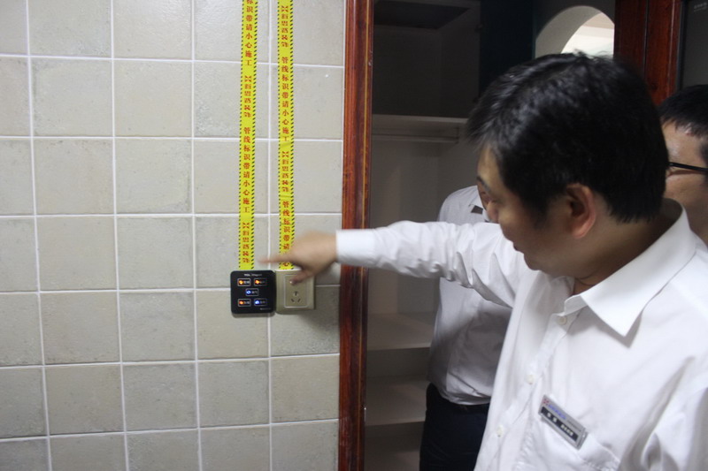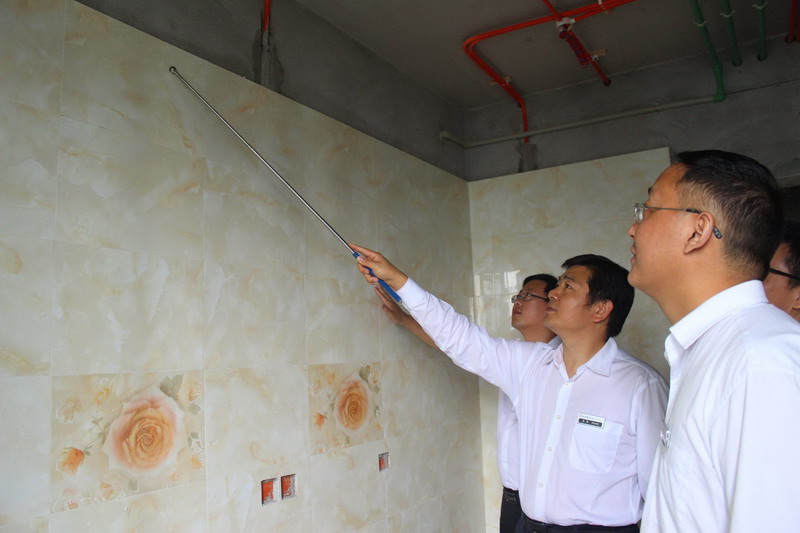 張總正在仔細(xì)檢查墻面貼磚情況