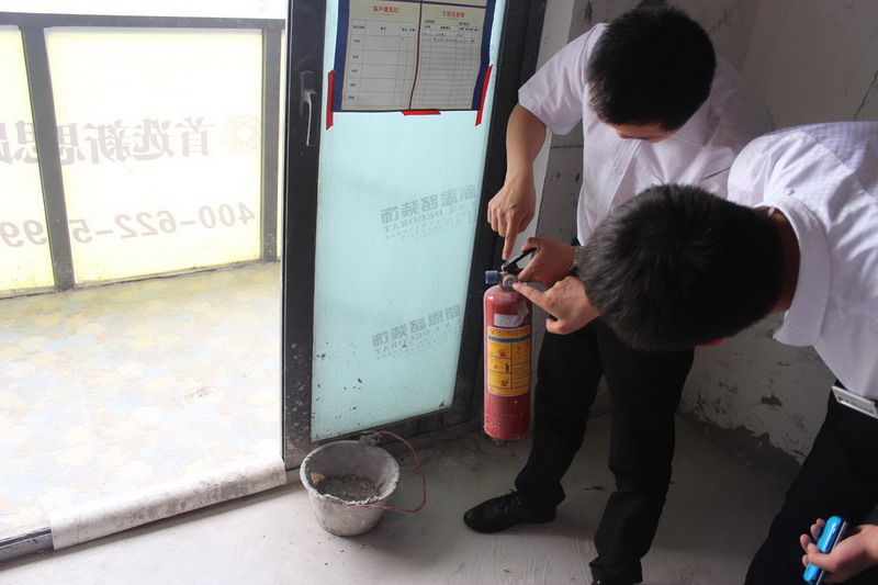 巡查人員正在認(rèn)真檢查滅火器是否符合安全標(biāo)準(zhǔn)