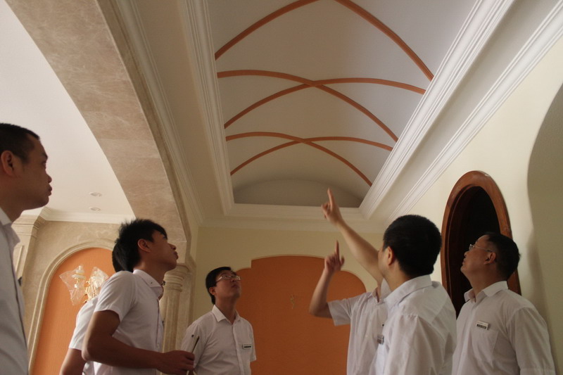 在雅居樂(lè)39-2工地。該別墅設(shè)計(jì)師——南坪店楊店長(zhǎng)向大家詳細(xì)講解了電視墻、頂面造型的設(shè)計(jì)技巧以及相關(guān)材料的使用等知識(shí)。大家也依據(jù)自身所學(xué)和相關(guān)施工經(jīng)驗(yàn),大膽提出自己的設(shè)計(jì)見(jiàn)解。工地大巡查不光確保了工程品質(zhì),同樣也拓寬了設(shè)計(jì)視野,為提升各店設(shè)計(jì)實(shí)力打下了堅(jiān)實(shí)的基礎(chǔ)。