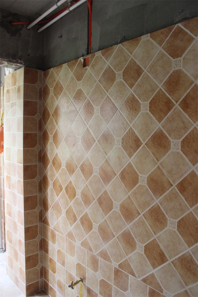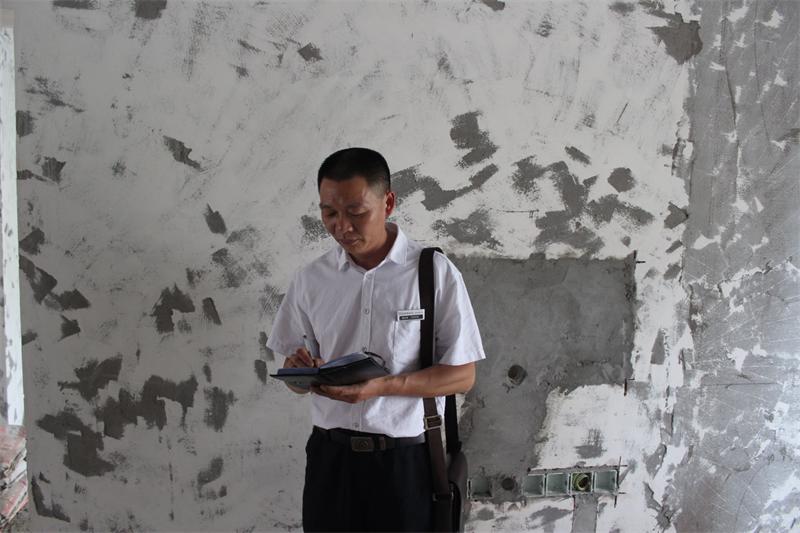 文經(jīng)理正在認(rèn)真檢查墻磚鋪貼情況