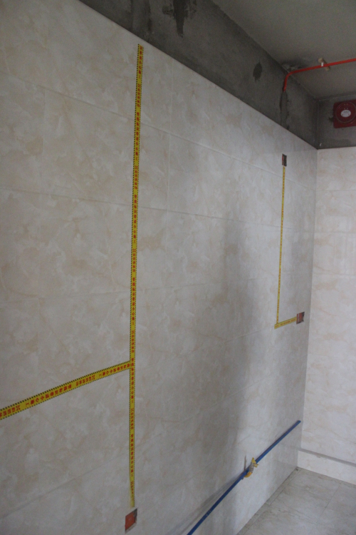 文經(jīng)理正在認真檢查墻面貼磚情況