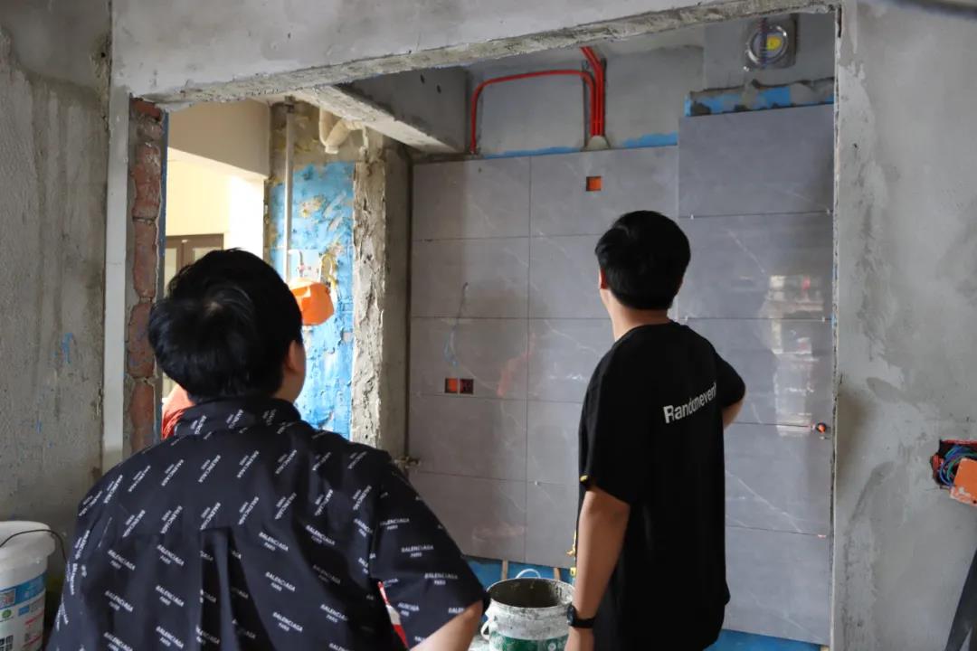 這處工地正在硬裝階段中,已經(jīng)安裝好的瓷磚、柜體等,都需要設(shè)計(jì)師檢查是否符合自己的設(shè)計(jì)要求。設(shè)計(jì)師戴杰在現(xiàn)場進(jìn)行仔細(xì)觀察,確保施工現(xiàn)場符合設(shè)計(jì)圖,保證我們設(shè)計(jì)圖的還原度。