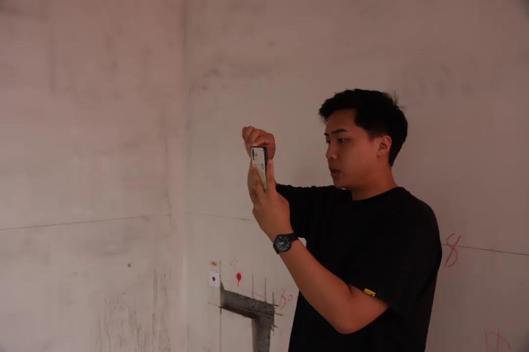 下一個(gè)工地是剛剛進(jìn)場的工地,一切都還處在初級(jí)階段。設(shè)計(jì)師戴杰再次核查現(xiàn)場情況,確保門窗保護(hù)膜等安裝規(guī)范,并將現(xiàn)場進(jìn)行拍照存檔、發(fā)給客戶。