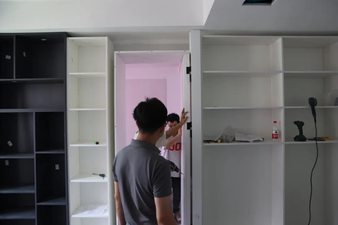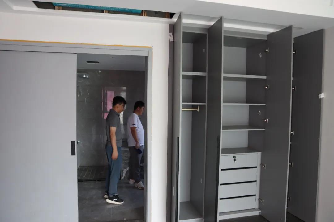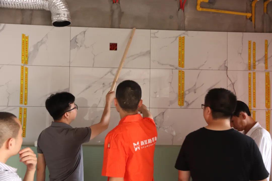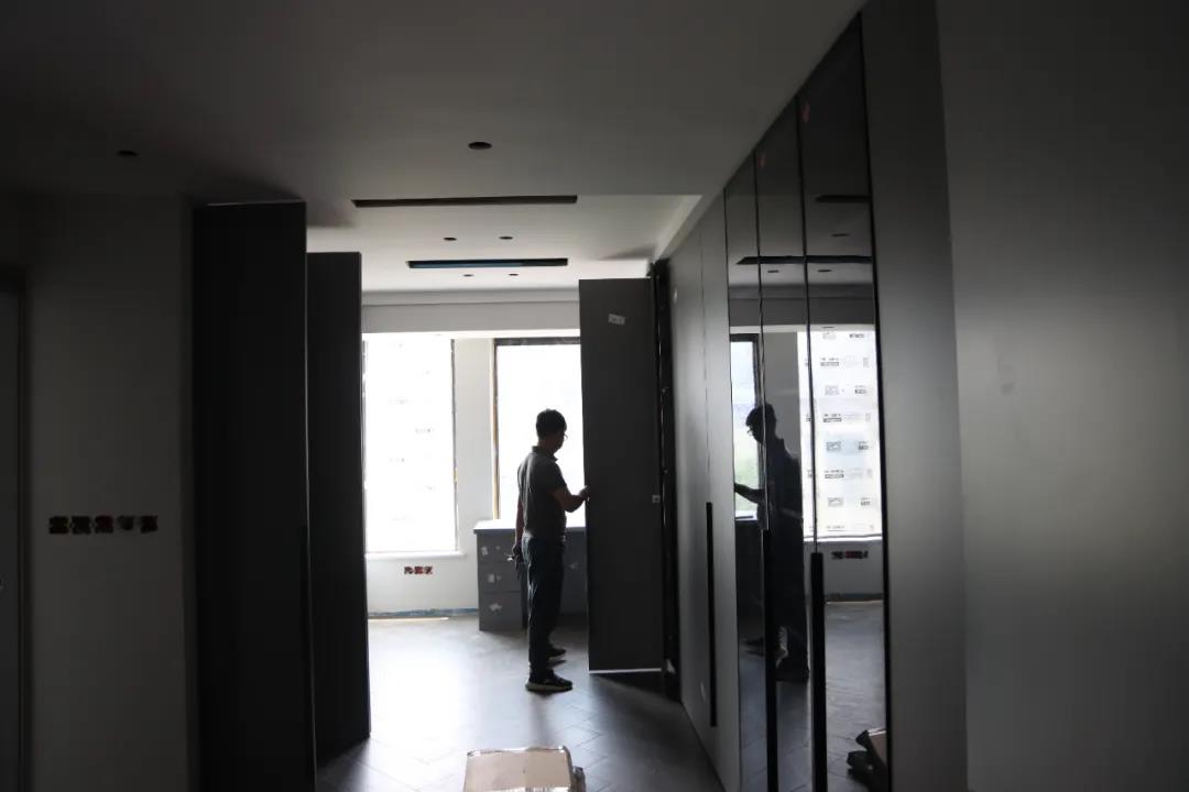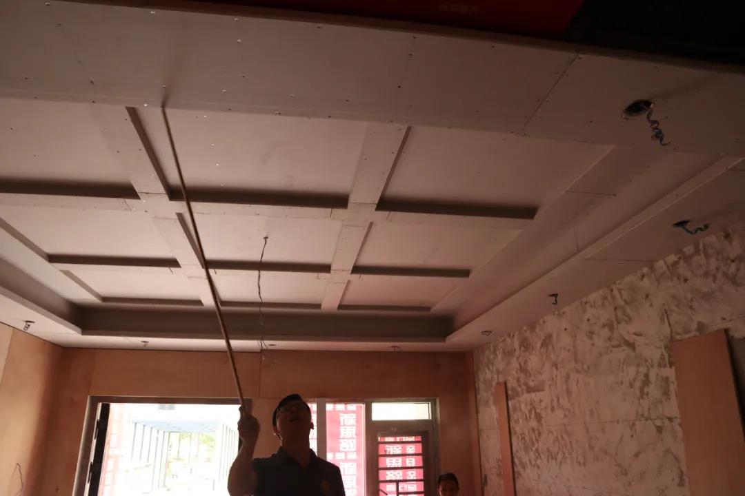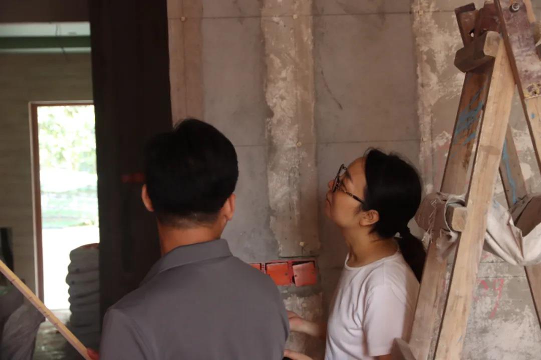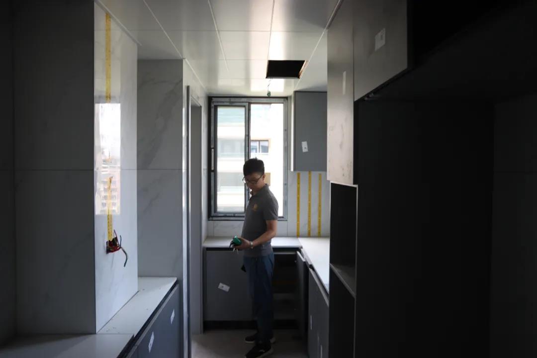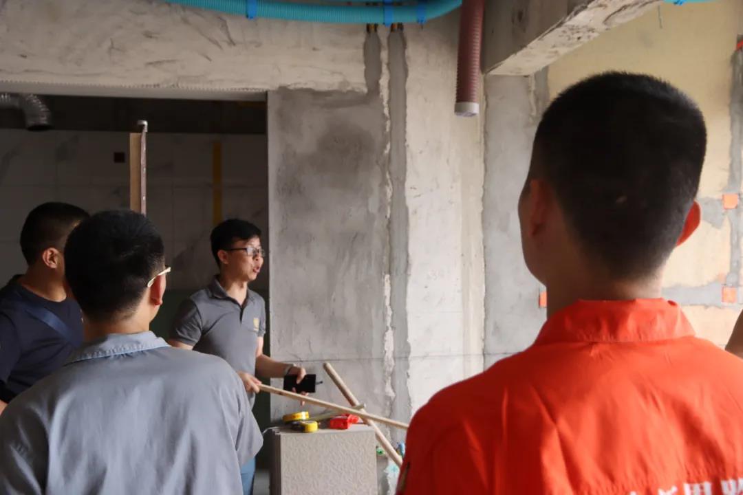 我們來到的第一處工地是水電階段剛結(jié)束、正在進行硬裝階段的工地??蛻粽诠さ厣喜榭辞闆r,設(shè)計師敖元壩剛到現(xiàn)場,就和我們在施工的工人以及在場的客戶交流起來。