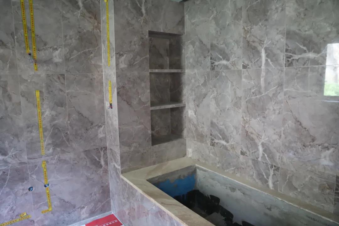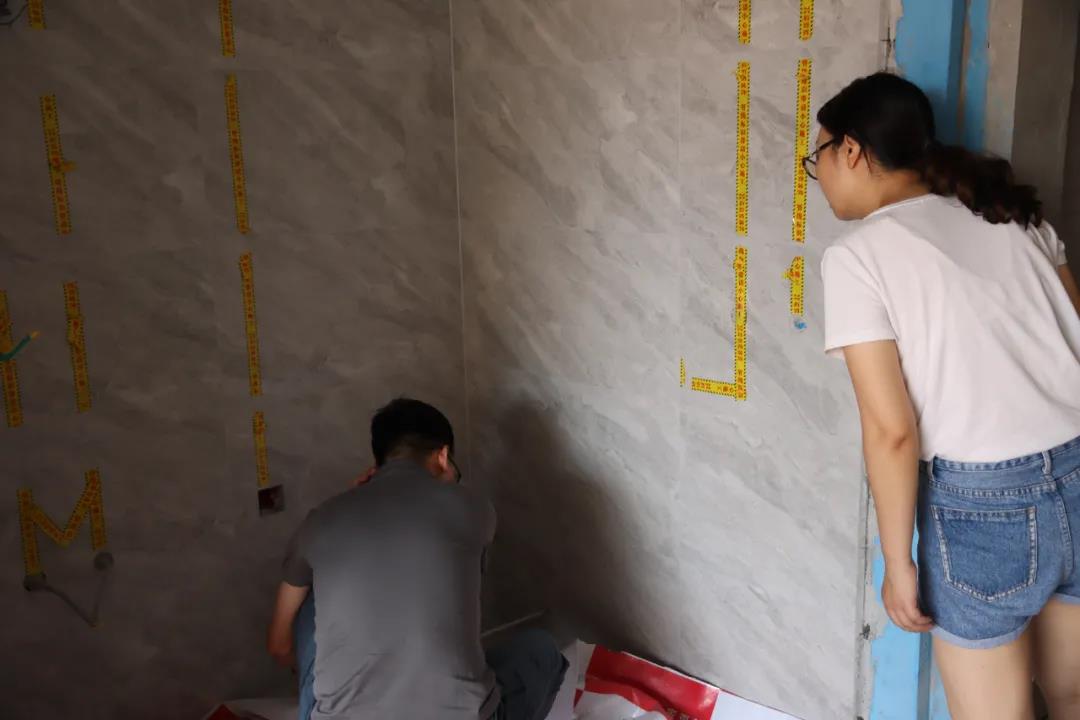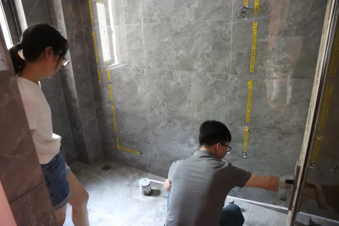 衛(wèi)生間瓷磚拼貼完成后,接下來就要準(zhǔn)備上馬桶、臺盆、柜子等的安裝。衛(wèi)生間空間有限,各個物品的尺寸需要復(fù)核多遍,保證最后在安裝的時候能夠正好符合。為此,設(shè)計師敖元壩和業(yè)主再次對衛(wèi)生間的一些尺寸進行了測量。