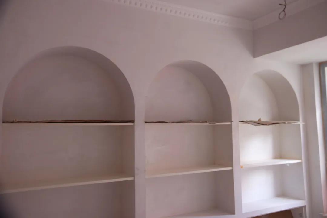 第三個工地正在硬裝進行中。這套案例設計上的巧思和花樣比較多,類似浮雕的花紋已經(jīng)做好造型,等待燈具的安裝;衛(wèi)生間的墻面也完成了,如同馬賽克的六邊形花紋拼貼低調(diào)中透露出一絲藝術(shù)性,拱門般的柜架設計還帶來不少別樣風情。相信在不久之后,這里會是客戶溫暖而美麗的家。