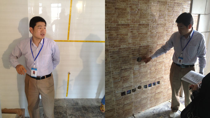 首先,我們來到位于沙坪壩濱江路的華宇金沙時(shí)代小區(qū)。到達(dá)施工現(xiàn)場(chǎng)正值漆工師傅緊張有序的施工,我們首先對(duì)泥作工藝進(jìn)行了查看,瓷磚的平整度、接縫差等一系列進(jìn)行了檢驗(yàn)。張總就工藝細(xì)節(jié)與大家共同探討,并在現(xiàn)場(chǎng)提出工藝上的問題,大家都積極的回答。當(dāng)即張總指出,我們的每一位員工都要對(duì)我們的施工工藝清楚的了解到,并如實(shí)的告知客戶。這樣才是真正讓客戶明明白白裝修。