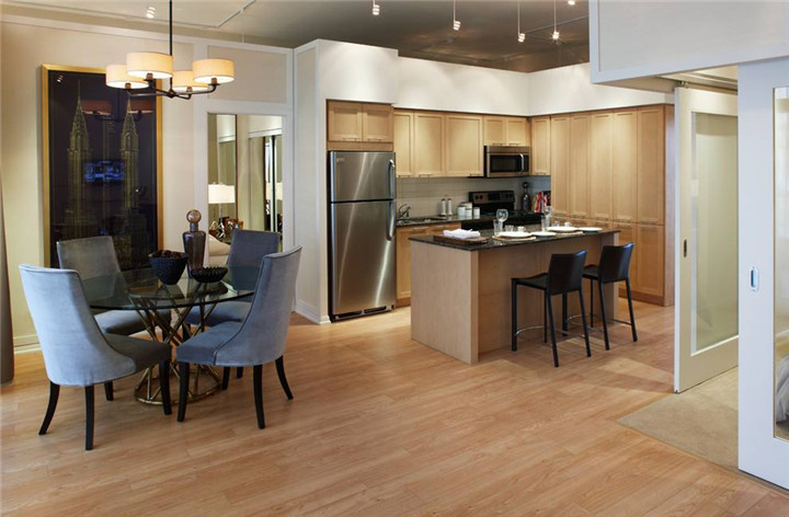 2:選用易潔材料。餐廳和客廳的墻面、地面應(yīng)與廚房一樣選用容易清潔的材料,地面最好選用地磚、強(qiáng)化地板等材料,切忌鋪貼實木地板,因為實木地板容易受熱氣影響產(chǎn)生變形,縫隙間也容易沾上油污。