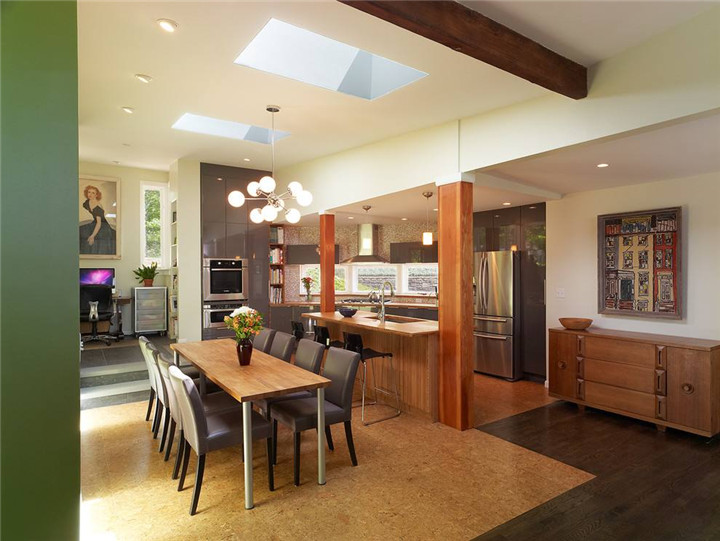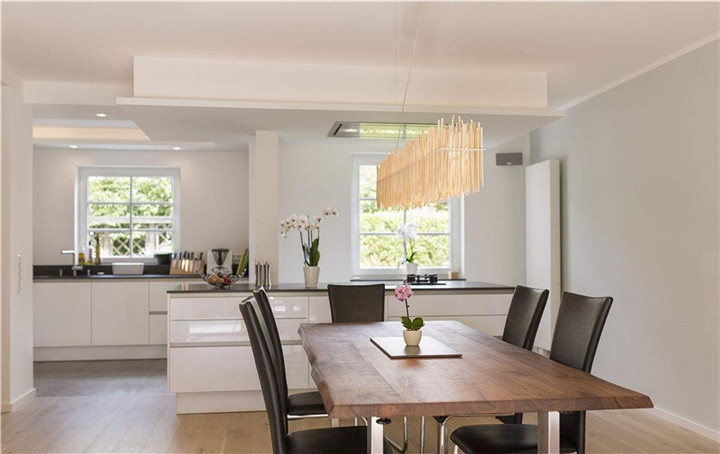 6:留出足夠回轉(zhuǎn)空間。餐桌椅在開放式廚房間的擺放,必須注意要留出烹飪操作空間。