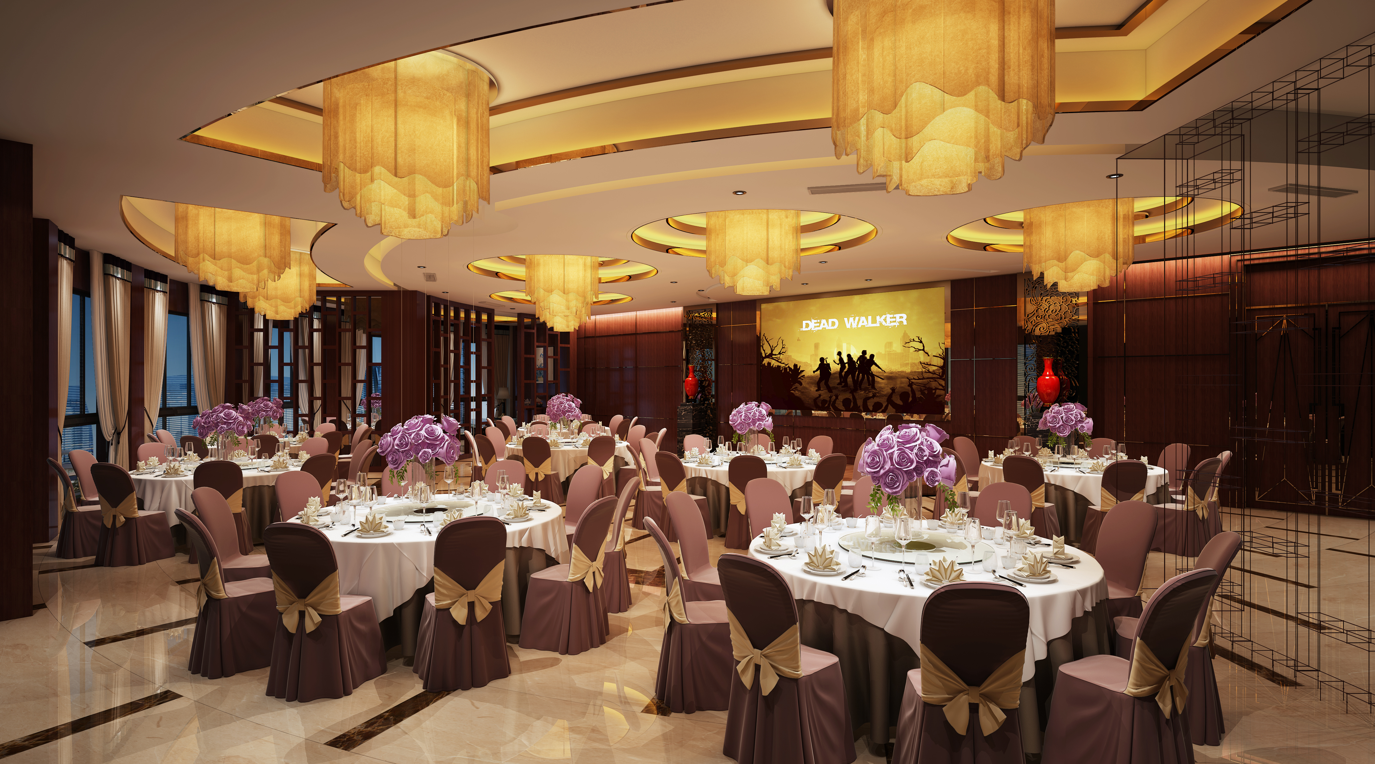選擇可為進餐提供和諧氣氛的圖畫。如食品寫生、歡宴場景或意境悠閑的風景畫等。當然各種仿真的鮮果裝飾也有著同樣的效果。其中,橘子代表富貴,桃子代表長壽和健康石榴代表多子多孫。鑲嵌在墻上或餐具柜上反映餐桌的鏡子,能夠反射出食物及餐桌,還可延伸空間,增強食物的能量是餐廳中非常好的立面裝飾之。