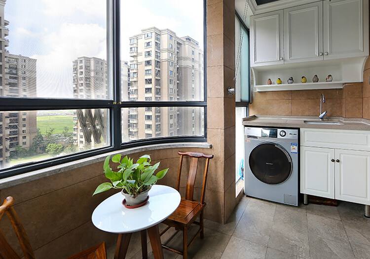 如果只是簡(jiǎn)單的白墻,這樣的設(shè)計(jì)未免顯得很單調(diào)、枯燥。如上面的小戶型陽(yáng)臺(tái)裝修效果圖所示,將木質(zhì)與磚墻結(jié)合,整體設(shè)計(jì)就變得豐富起來。陽(yáng)臺(tái)空間中預(yù)留一個(gè)位置,可以用來放置洗衣機(jī),小巧簡(jiǎn)單又實(shí)用。